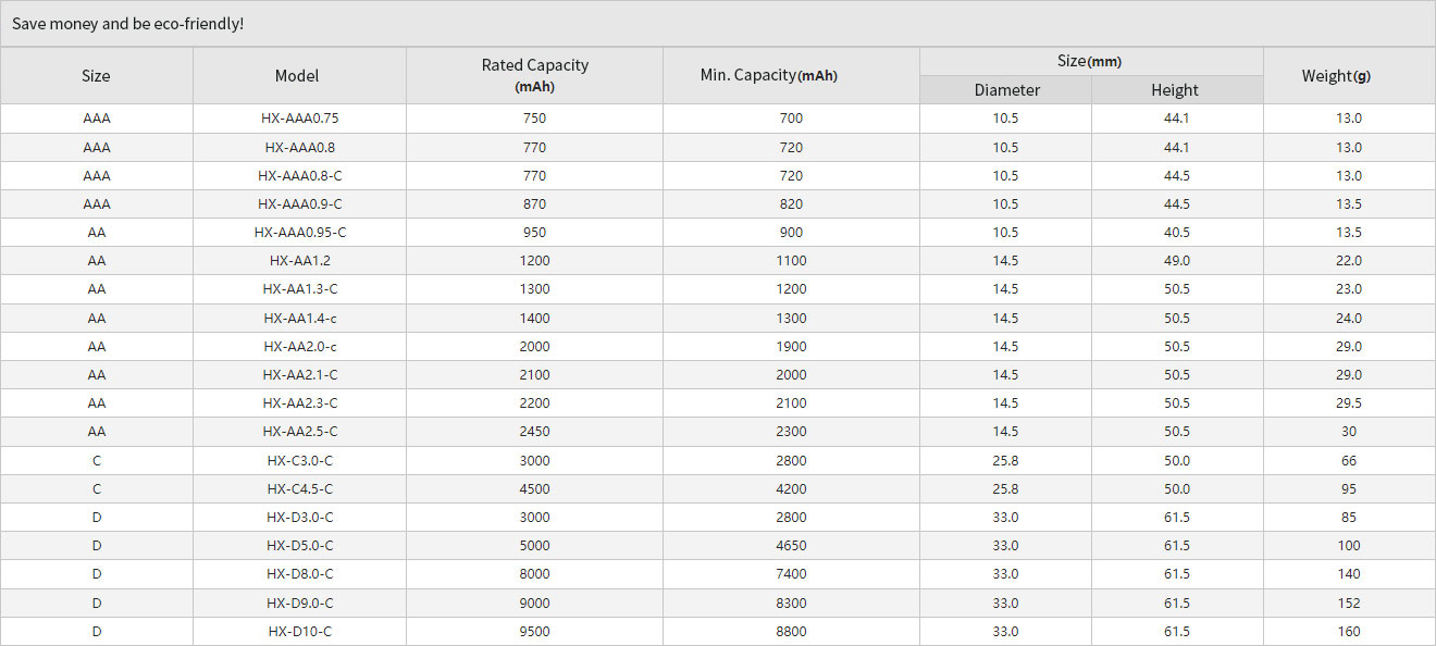 A fully charged battery can retain more than 80% of their capacity when stored and shelved in a room temperature for 1 year, and retain more than 70% of their capacity for 5 years, making them readily available;
